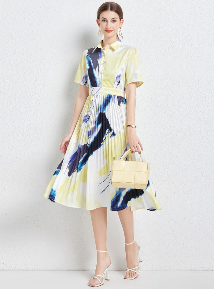 Get ready to turn heads this season in chic print dress. Featuring a vibrant yellow abstract print, this dress is a versatile addition to your wardrobe. The short sleeves and shirt collar give it a relaxed yet sophisticated vibe. Its pleated midi skirt, falling in between medium and long, gives a flattering silhouette and lends a romantic touch to the dress. Whether you're heading to a casual lunch or an evening soiree, this dress is your perfect companion. Pair it with ankle boots and a chic clutch for an edgy look, or team it with strappy sandals and dainty jewelry for a more feminine flair. With this dress, you're bound to be the belle of the ball at any occasion.