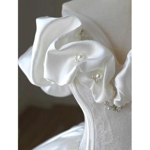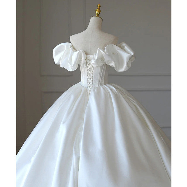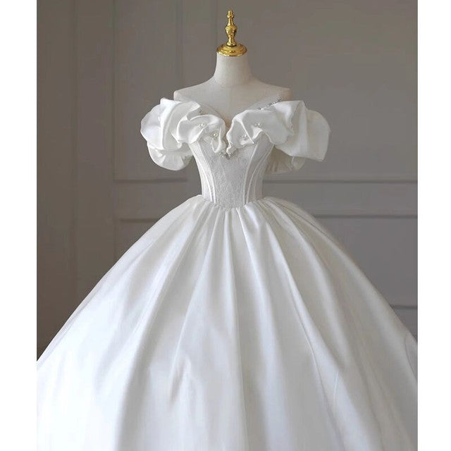 Ball Gown Satin Off the Shoulder Pearls Wedding Dress