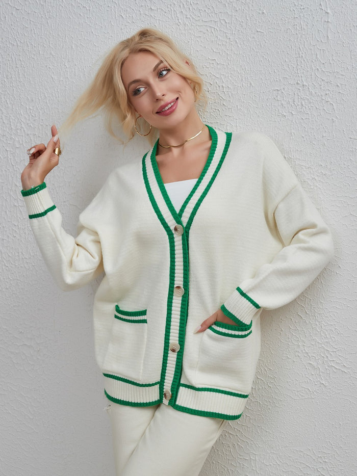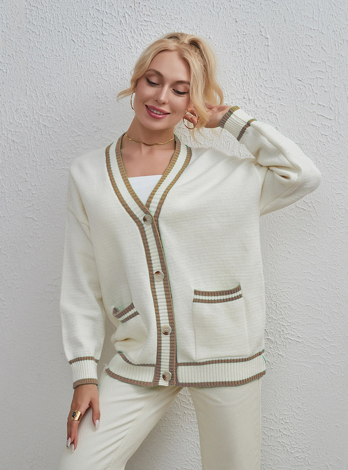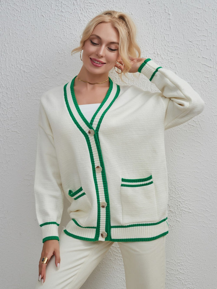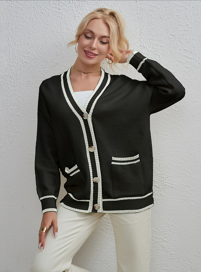 Let us introduce you to the cardigan that strikes the perfect balance between casual and elegant. This black piece is far from ordinary with its loose fit, V-neckline, and cozy long sleeves. What truly sets it apart is its unique two-tone color matching. The buttons running down the front add that extra oomph, making it the cardigan that you'll reach for again and again. Versatile in its ordinary length, this is the sweater that your wardrobe has been waiting for.