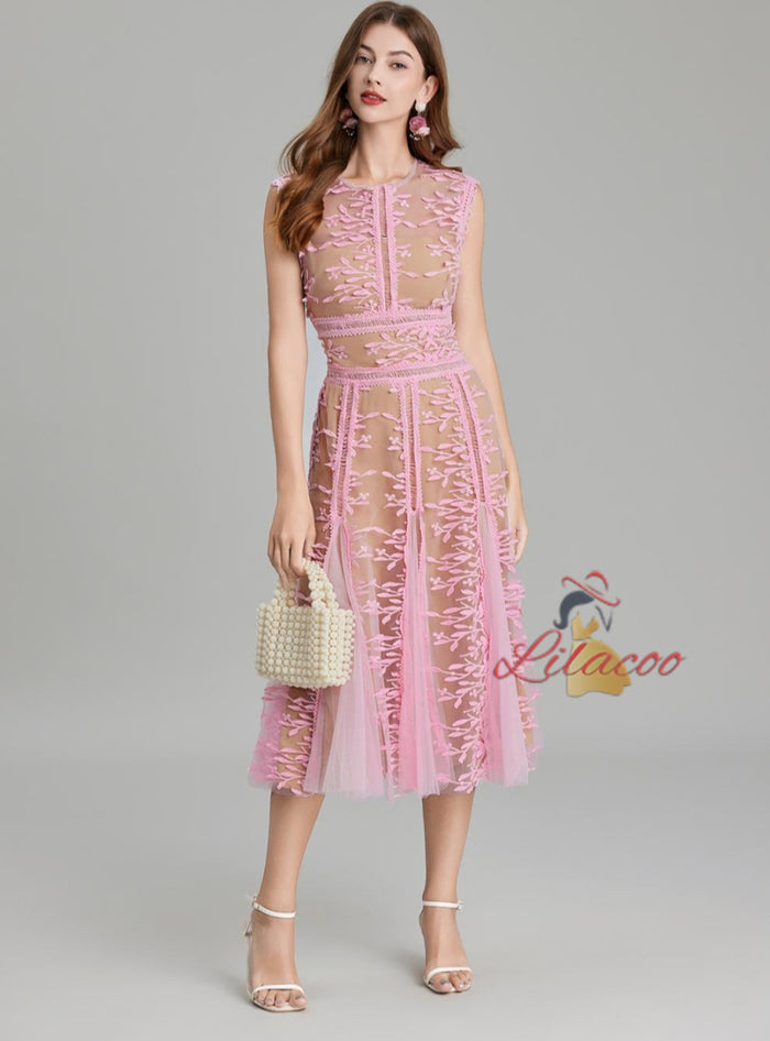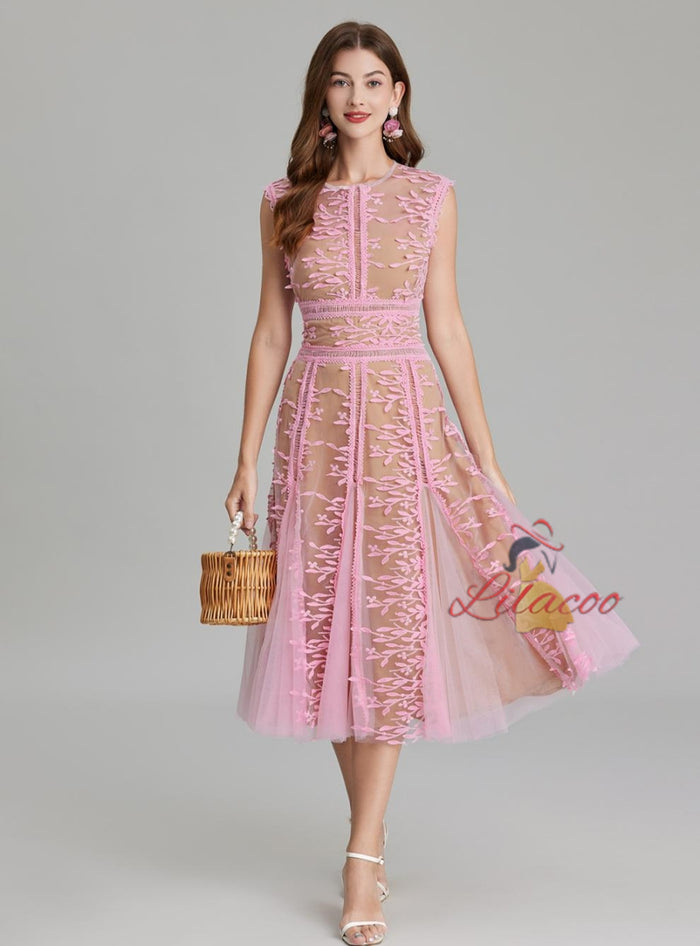 Step into a world of romance with this Pink Embroidered Tulle Dress, an enchanting choice for special occasions. The delicate embroidery on the bodice and skirt creates a whimsical look, while the soft tulle overlay adds a dreamy, ethereal quality. The sleeveless design is complemented by a fitted waist that enhances your figure and gives way to a flowy, twirl-worthy skirt. Perfect for cocktail parties, romantic dinners, or evening celebrations, this dress pairs beautifully with statement earrings and heels. The lightweight fabric and breathable design ensure you feel comfortable while making a lasting impression. Its soft pink hue and intricate detailing create a look that’s effortlessly feminine and undeniably graceful. Elevate your style and make this dress the highlight of your collection.