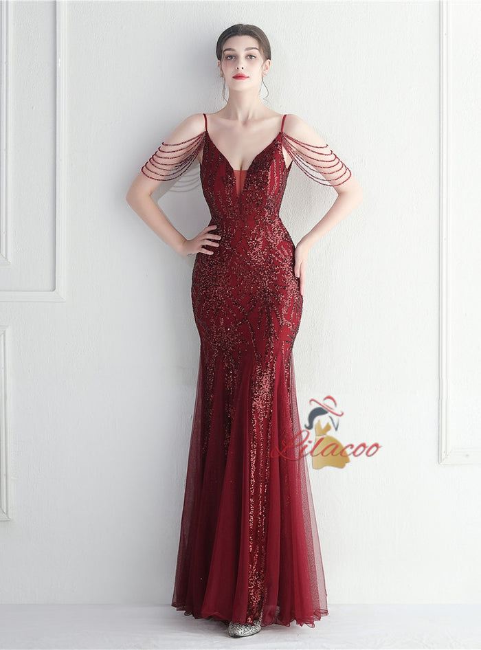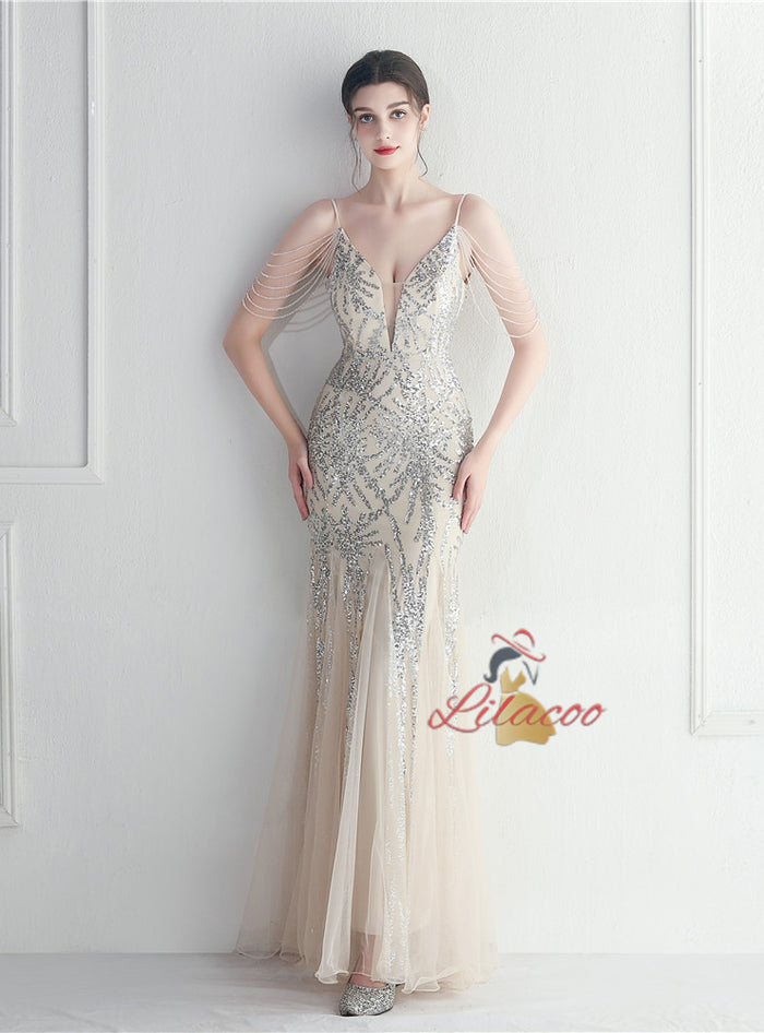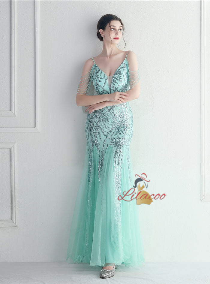 Mermaid Sequins Tulle Spaghetti Straps Beading Prom Dress