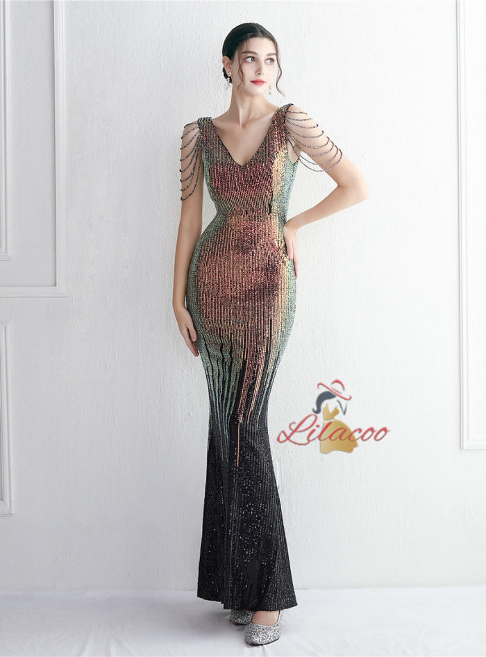 Mermaid V-neck Sequins Beading Prom Dress