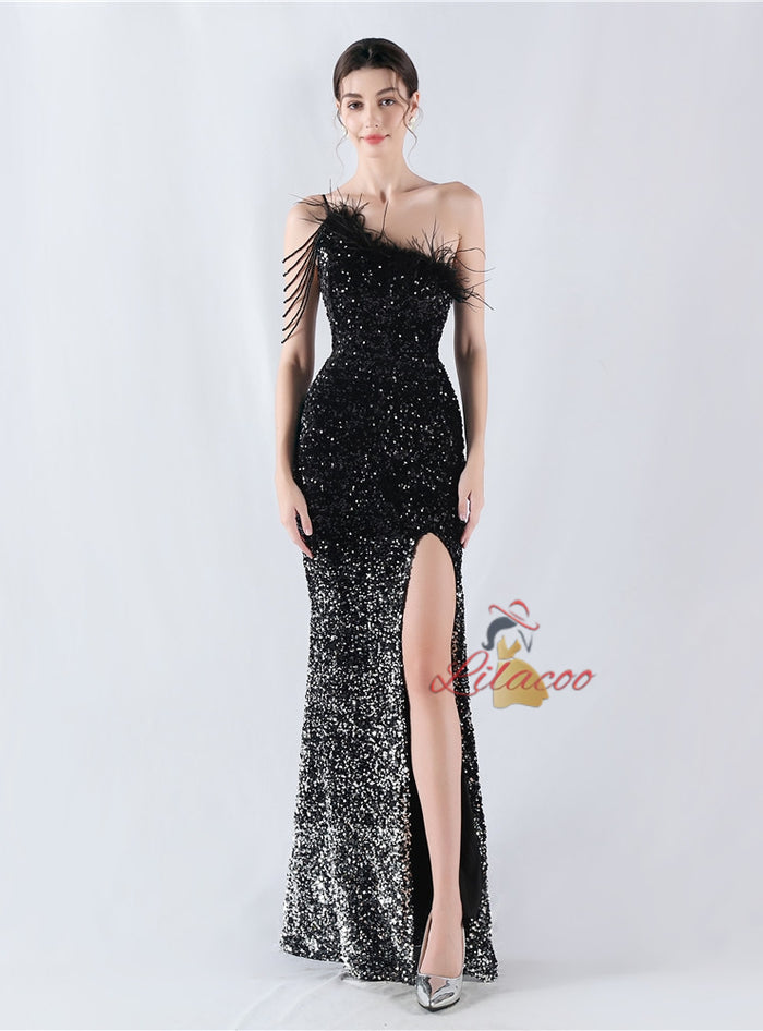 One Shoulder Mermaid Sequins Feather Split Prom Dress