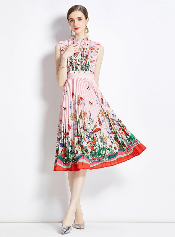 Embrace the vibrancy of the season with our retro style dress. This standout piece, adorned with a delightful floral pattern, is a must-have for your wardrobe. The dress boasts a beautifully crafted print design, accentuated by pleats in front that provide a flattering drape. The flowing flounce skirt, falling to a medium and long length, adds a whimsical charm to the ensemble. This dress features a feminine floral ruffle hem that enhances its dreamy allure. With a classic round neck and sleeveless design, it's perfect for warm-weather outings.This dress promises an eye-catching look for all your upcoming occasions - it's everything you've been looking for and more!