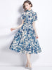 Retro Blue and White Ink Print Short Sleeve Slim Dress