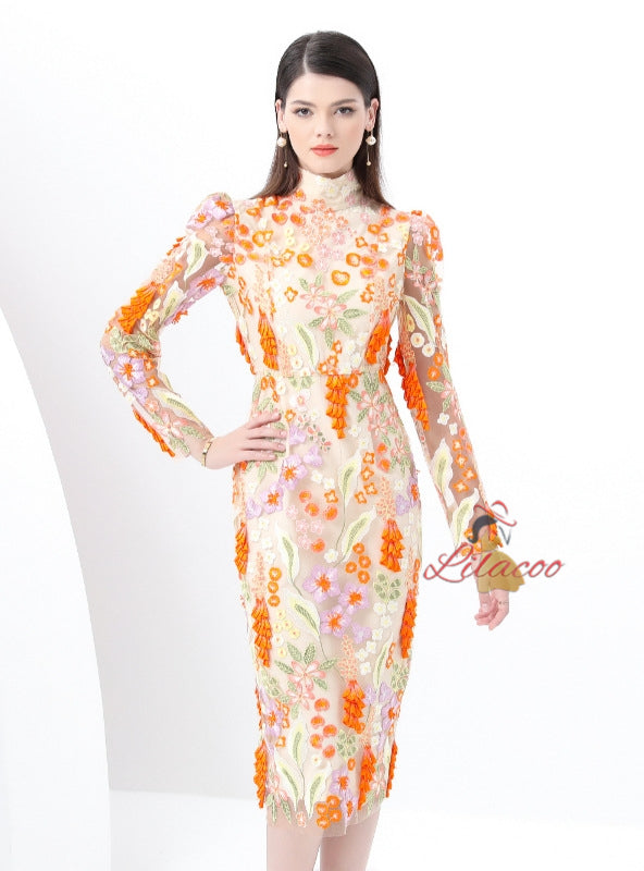 Retro Long-sleeved Slim Embroidered Dress