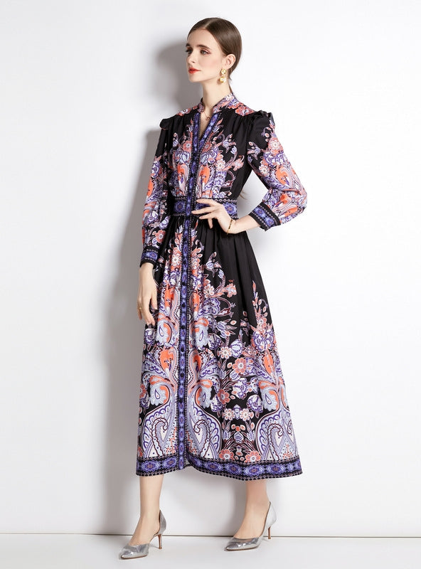 Defined by its exquisite print, this dress combines intricate paisleys with delicate florals, offering a visual feast for the eyes. The tailored waist and soft pleats emanate femininity, while the long sleeves and v-neckline maintain a sense of sophistication. This garment is a perfect harmony of bold pattern and subdued elegance, ideal for those who favor a statement piece that's both artful and wearable.