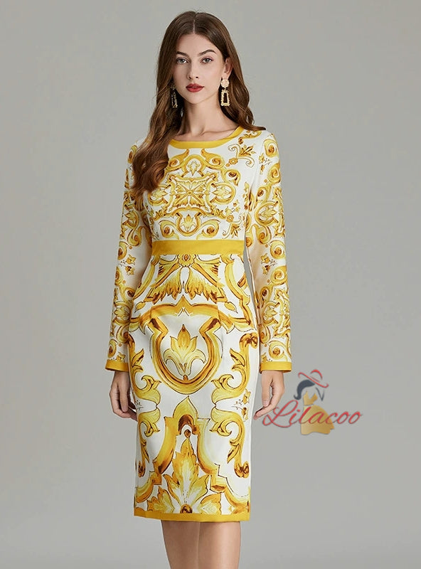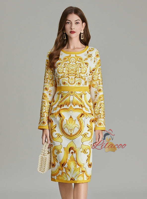 Retro Round Neck Printed Long-sleeved Slim Dress