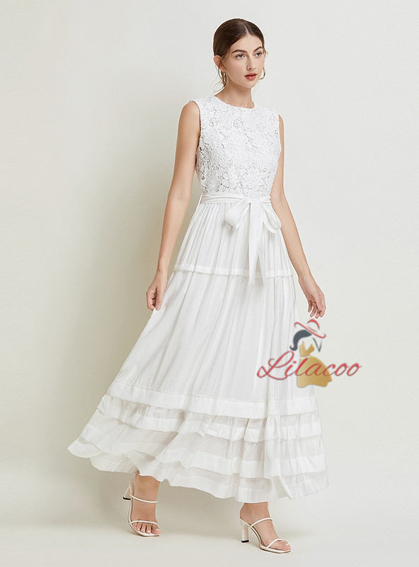 Savor the grace and simplicity of the White Sleeveless Maxi Dress, a perfect choice for summer elegance. The lace bodice with its intricate patterns creates a refined and feminine appeal, while the flowing skirt with tiered layers adds movement and charm. A sash belt at the waist ties the look together, emphasizing your figure and adding a romantic touch. Crafted from lightweight and breathable fabric, this dress is ideal for beach weddings, garden parties, or sunset dinners. The sleeveless design ensures cool comfort in warm weather, making it a practical yet stylish option. Pair it with delicate sandals for a relaxed vibe or with strappy heels for a formal finish. This dress is a stunning combination of ease and sophistication, providing a go-to piece for occasions that call for effortless style.