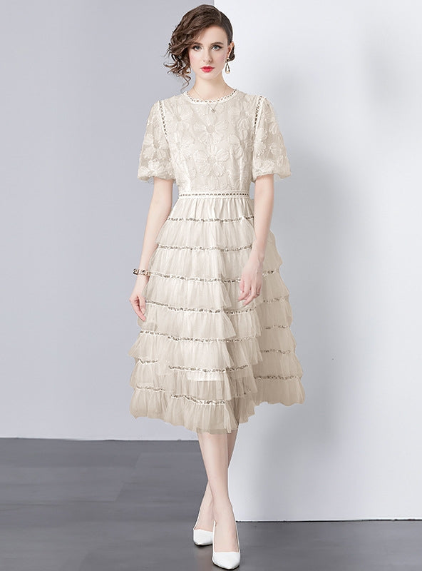 Sensationally elegant, this white lace dress with tiered layers offers a fresh take on classic bridal and event wear. It features exquisite lace detailing throughout, creating a cohesive and sophisticated look that is sure to turn heads. The dress's construction includes a discreetly cinched waist, which helps define the silhouette without detracting from the soft, flowing lines of the tiers. Each layer is finely crafted to move gracefully with the wearer, lending an ethereal quality to the overall ensemble. This dress is particularly suited for high-end events, offering both comfort and unparalleled style that caters to the discerning fashionista.
