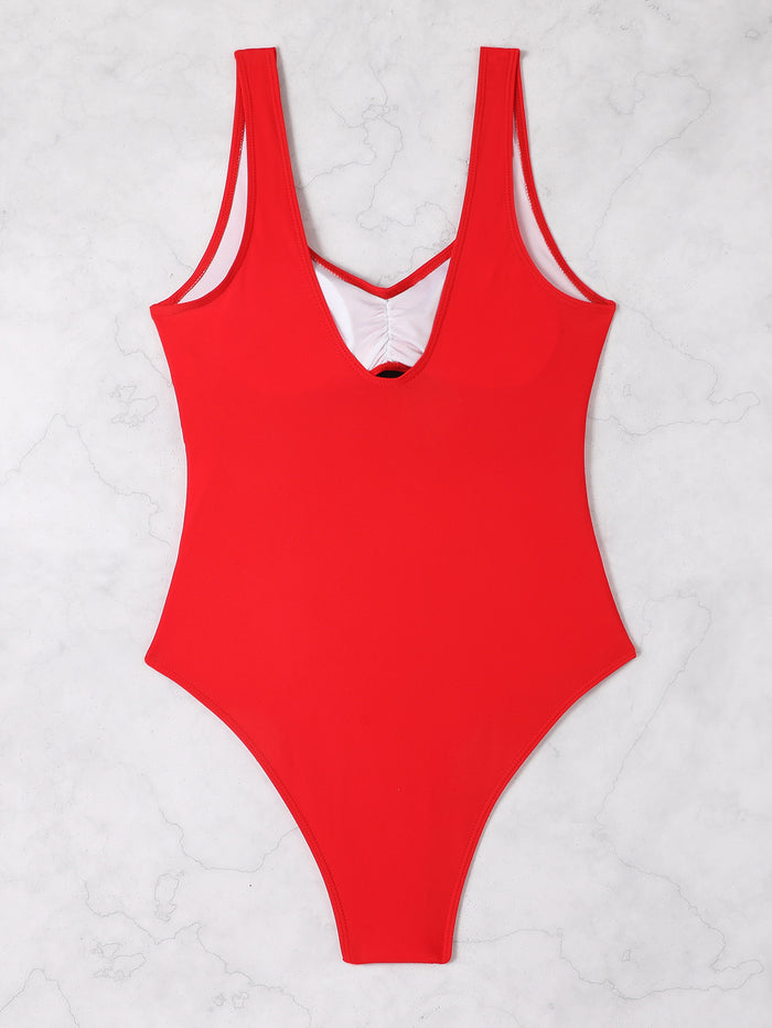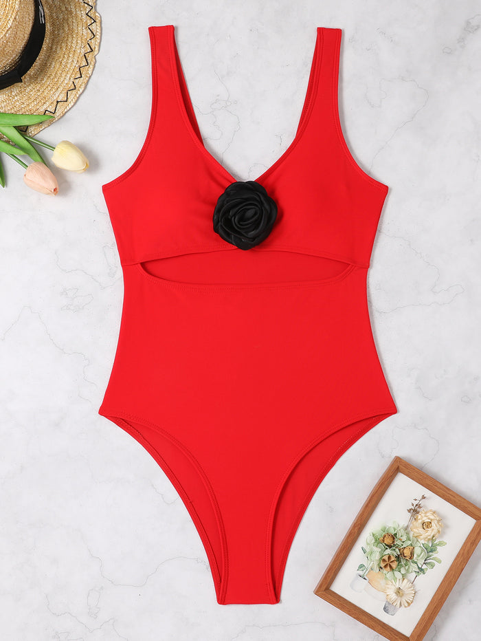 Sensationally chic, this black one-piece swimsuit is a stunning blend of elegance and modern design. The classic black fabric is complemented by a beautifully crafted white floral applique at the center, adding a touch of femininity and sophistication. The unique cutout detail below the bust creates a flattering and contemporary silhouette, making this swimsuit perfect for making a stylish statement. Made from high-quality, stretchable fabric, this swimsuit offers both durability and a soft, comfortable feel against the skin. The sleek design and timeless colors make it a versatile piece for any summer occasion. Ideal for lounging by the pool or enjoying a day at the beach, this swimsuit is perfect for those who appreciate a blend of classic beauty and modern flair. Pair it with a wide-brimmed hat and oversized sunglasses for a complete, polished look. Embrace the elegance and sophistication of this beautifully designed swimsuit and enjoy your summer with confidence and style.