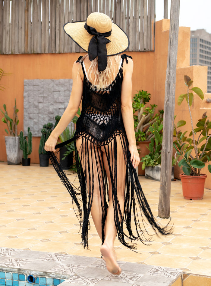 Airing a sense of playfulness with every step, this tasseled bikini cover-up is a true embodiment of beachside whimsy. Its white macramé upper section provides a textured contrast to the lively tassels that dance around the knees. The sun-bleached hues of the tassels suggest the bright, carefree days of summer, while the airy design ensures you stay cool in the heat. With its pull-on style, this cover-up is as effortless as it is eye-catching, ideal for the woman who wants to add a touch of vibrancy to her beach attire. It’s not just a practical piece for modesty between dips in the ocean; it’s a fashion-forward addition to your summer wardrobe.