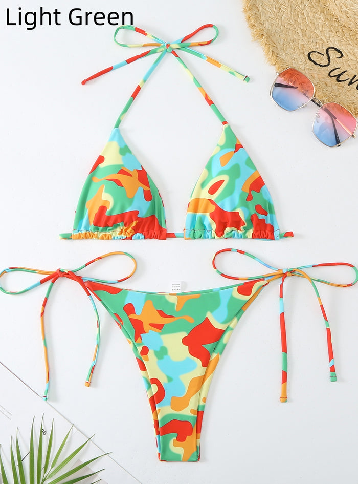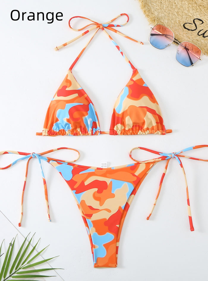 Glisten under the sun in this dynamic and colorful bikini set, perfect for making a bold statement. This bikini features a vibrant abstract pattern in pink, blue, and orange hues, ensuring you stand out wherever you go. The triangle top is designed with adjustable ties at the neck and back, allowing for a perfect fit that offers both comfort and support. The bikini bottoms are also equipped with adjustable side ties, ensuring a secure fit that enhances your silhouette. Constructed from premium, high-quality fabric, this bikini offers durability and excellent resistance to fading and wear. Ideal for both lounging by the pool and enjoying beach activities, this bikini seamlessly blends style and practicality. Elevate your swimwear collection with this lively and fashionable bikini set, perfect for any sun-soaked adventure.