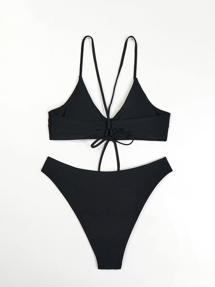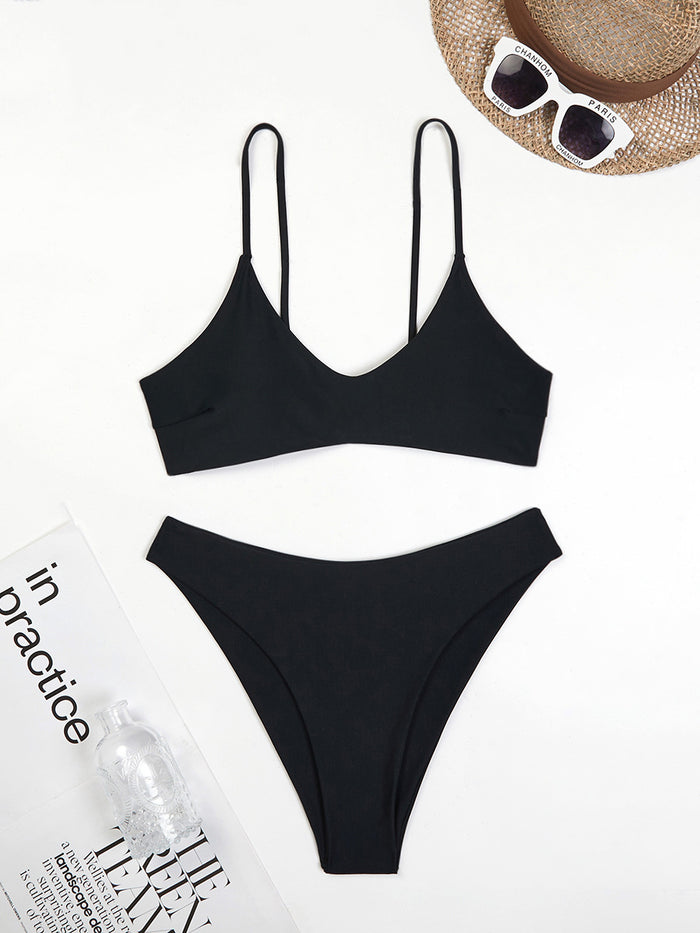 Rhapsody in black, this bikini set is designed for the fashion-forward individual who values both style and comfort. The sleek black color exudes sophistication, making it a versatile piece for any beach outing. The top features a contemporary design with a cross-over front, providing a flattering and supportive fit. Adjustable straps allow for a customized fit, ensuring maximum comfort. The high-cut bottoms are crafted to enhance your natural curves, offering a sleek and modern silhouette. Made from premium-quality fabric, this bikini set ensures durability and a soft feel against the skin, perfect for long days in the sun. The minimalist design allows for easy mixing and matching with other swimwear pieces, giving you endless styling options. Whether you're lounging by the pool or taking a dip in the ocean, this bikini set will keep you looking chic and feeling confident. Embrace the timeless elegance and modern design of this must-have swimwear piece.