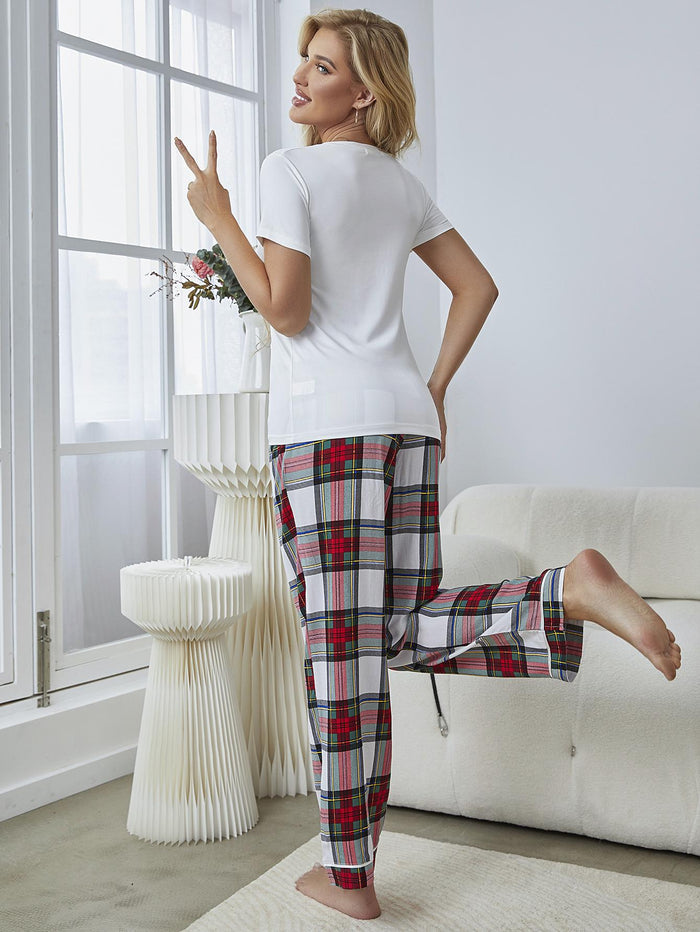 Cozy meets modern in this pajama suit, where the simplicity of the white top complements the bold plaid pattern of the pants. The V-neck tee is a versatile piece that can transition from sleepwear to daywear, while the pants feature a drawstring waist for an adaptable fit. This pajama set is perfect for those who value both style and comfort in their lounging attire.