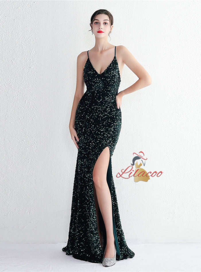 Spaghetti Straps Mermaid Sequins Split Prom Dress