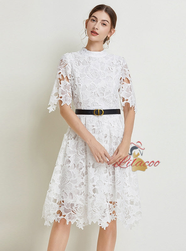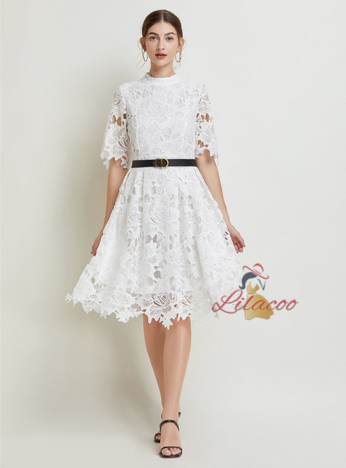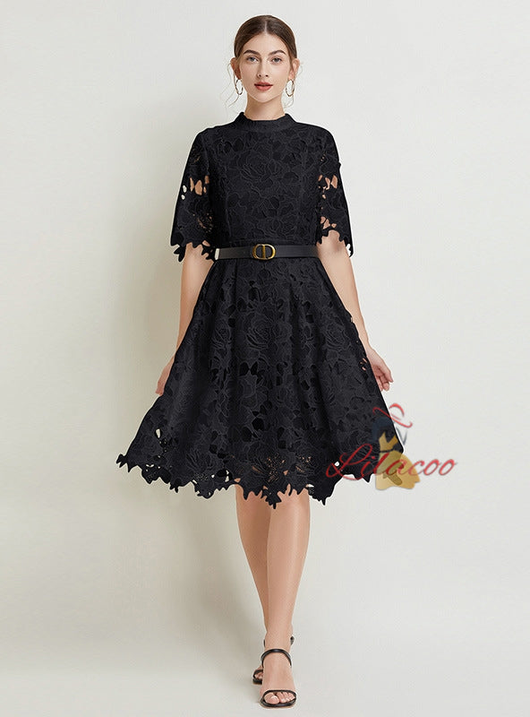 Saturate your wardrobe with elegance by adding this Green Floral Lace Dress, a masterpiece of style and sophistication. The intricately designed floral lace fabric offers a luxurious texture, while the high neckline and mid-length sleeves provide a modest yet refined look. The flared skirt adds a playful yet elegant touch, creating a flattering A-line silhouette that suits any figure. The slim belt enhances the waistline, adding structure and a tailored finish. Whether for a garden party, a wedding, or an upscale brunch, this dress transitions effortlessly from day to night. Pair it with black heels and minimal accessories to let the vibrant green shine. The breathable material ensures comfort, allowing you to feel as good as you look. Elevate your style with this timeless and versatile piece that blends classic design with modern appeal.