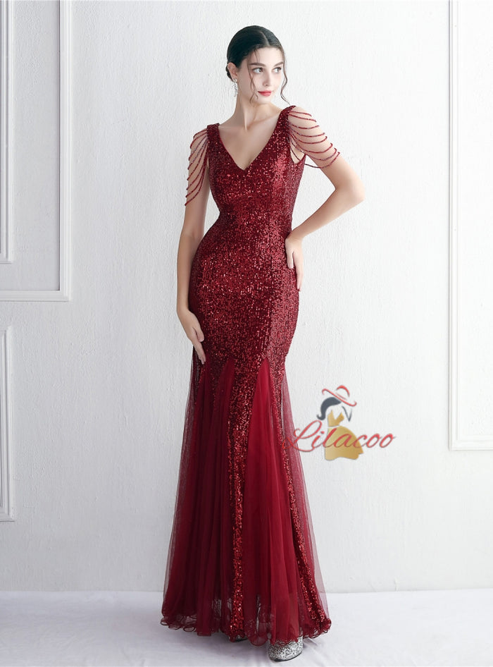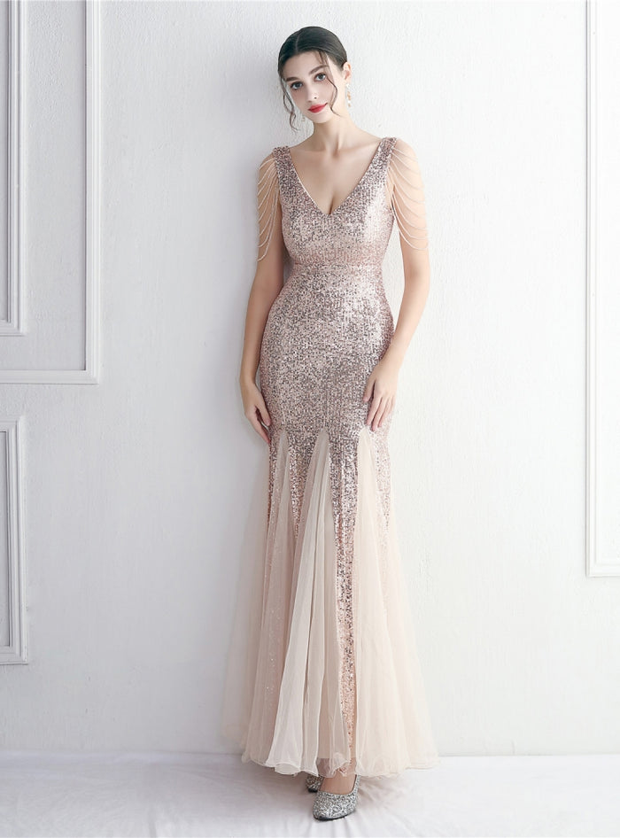 Tulle Sequins V-neck Beading Prom Dress