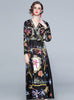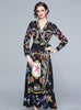 V-Neck Long Sleeve Retro Printed Waist Dress