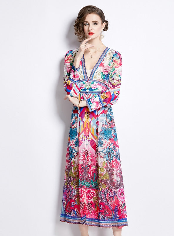 Skilfully crafted, this maxi dress stands out with its bold and intricate array of colors and patterns, perfectly embodying the essence of bohemian chic. The dress features a deep V-neckline that adds a hint of allure, complemented by a fitted waist that transitions into a flowing skirt, offering both style and comfort. The long sleeves are subtly flared at the cuffs, enhancing the dress's elegant silhouette. This garment is made from a lightweight fabric that ensures breathability and ease of movement, making it ideal for festive occasions, outdoor weddings, or vibrant summer gatherings. The mesmerizing pattern, inspired by traditional folk art, includes floral and geometric motifs, creating a visually stunning piece that's as unique as it is beautiful.