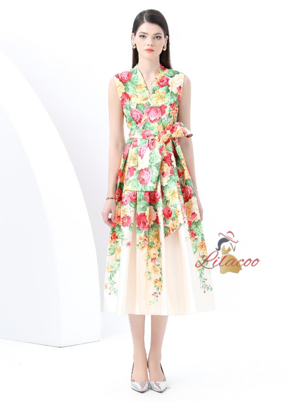 V-neck Sleeveless Long Retro Print Dress