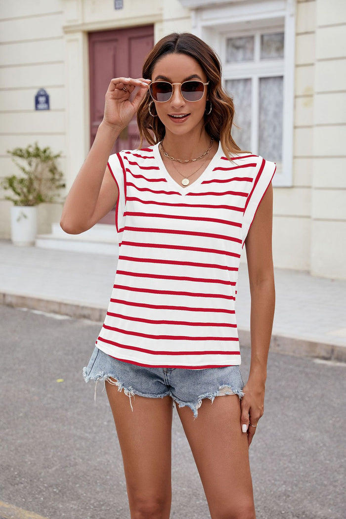 V-neck Striped Short Sleeve Loose T-shirt