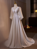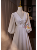 White V-neck Puff Sleeve Pleats Wedding Dress