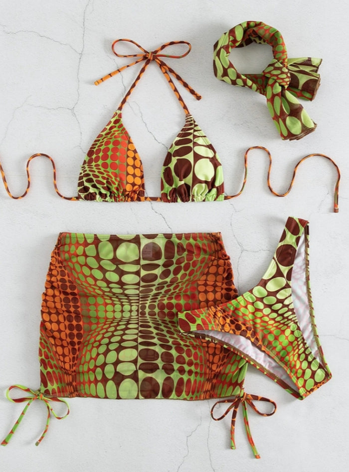 Generate an unforgettable look with this striking geometric bikini set, crafted to offer both style and comfort. The bikini top features a classic triangle shape with adjustable halter straps, providing a secure fit that enhances your natural shape. The unique geometric pattern in warm, earthy tones brings a touch of artistic sophistication to your beachwear. The high-cut bikini bottoms are designed to highlight your curves, offering a flattering fit that elongates your legs. This set also includes a matching wrap skirt, adding versatility and elegance to your beach ensemble. Crafted from premium, quick-drying fabric, this bikini set is both durable and comfortable, making it ideal for all your beach and poolside activities. The bold pattern and vibrant color scheme make this bikini set a standout piece. Perfect for those who love to combine modern design with practical comfort, this bikini set is an excellent addition to your swimwear collection. Feel confident and stylish with this beautifully designed bikini set.