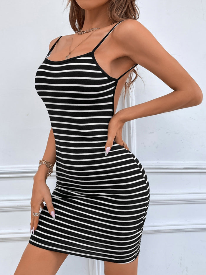 The ribbed stretch knit fabric in a black and white striped pattern creates a flattering bodycon dress with a straps neckline and a fitted silhouette, perfect for any occasion. The midi skirt features dual side slits that add a touch of sophistication and elegance to the dress, while the overlapping cutout detail at the back adds a stylish twist. The hidden elastic band offers built-in support at the bust, making this dress as comfortable as it is chic. Whether you're attending a special event or just want to add some glamour to your everyday wardrobe, this dress is the perfect choice for a sophisticated and unforgettable look. Don't miss out on the chance to add this must-have piece to your collection!