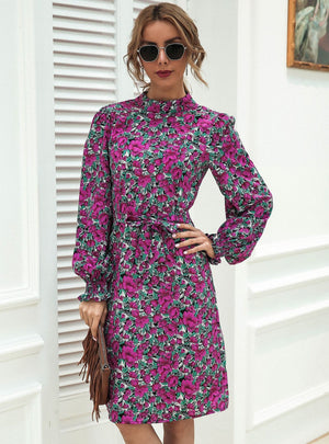 V-neck Printed Trumpet Sleeve Leaf Dress