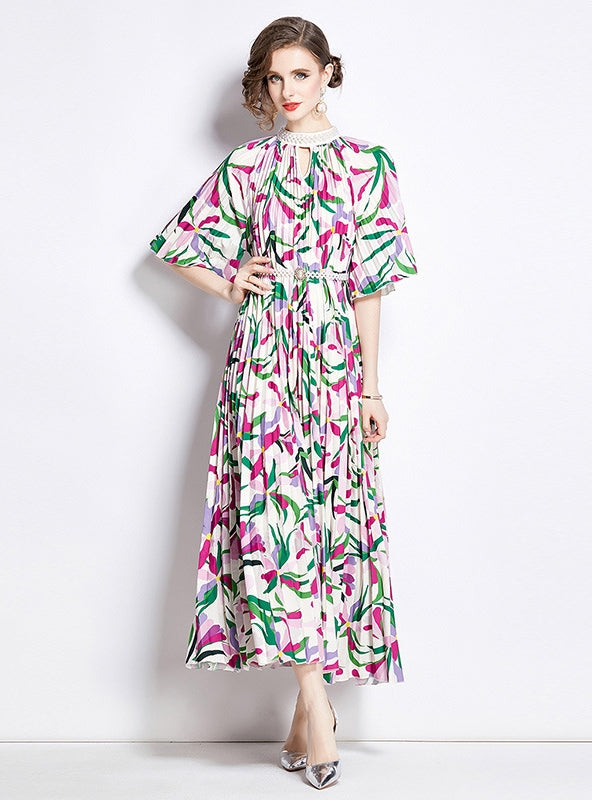 Exuberance blooms in the form of this enchantingly voluminous dress, a creation that exudes the vivacious spirit of spring. Adorned with a lush pattern of magenta and emerald florals, this garment cascades with confidence and a painterly charm. Its high, ruffled neckline adds a touch of demure sophistication, harmoniously juxtaposed with the playful, elbow-length puff sleeves that gather with grace. At the waist, a string of pearl-like beads cinches the silhouette, enhancing the natural waistline and giving way to a full, gathered skirt that twirls with unbridled joy. This dress is a visual sonnet to the beauty of blooming gardens and the unapologetic celebration of color, making it a perfect choice for garden parties or any event where making a memorable entrance is on the agenda.