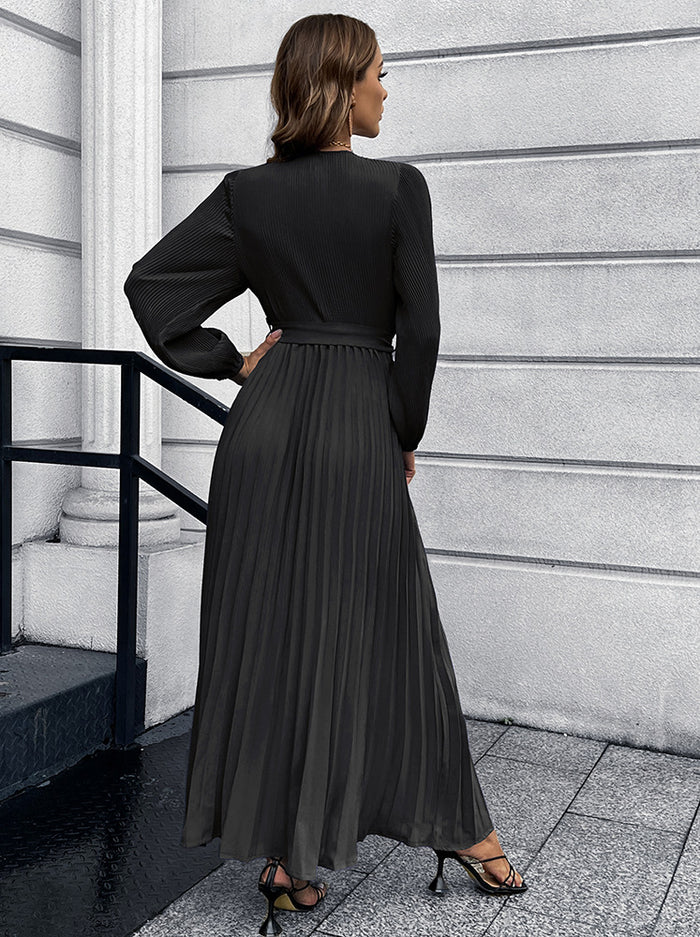 V-neck Long-sleeved Pleated Long Dress