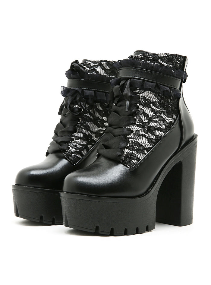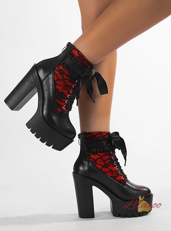 Lace Color Matching Zipper Retro Thick Heel Booties