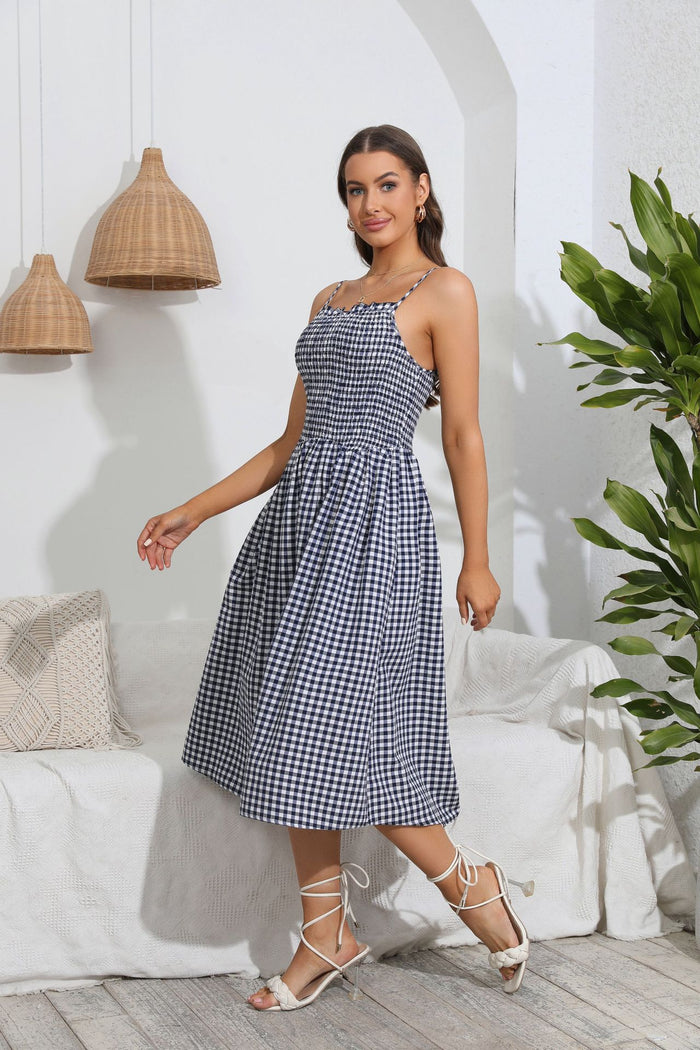Experience vintage-inspired elegance with the charming plaid dress. Meticulously crafted from cotton, this midi-length dress features a lovely gingham pattern, fitted bodice, slender straps, and a button-front design. Enhanced with denim stripes and a comfortable elasticated back, it's a timeless addition to your wardrobe that exudes effortless style.