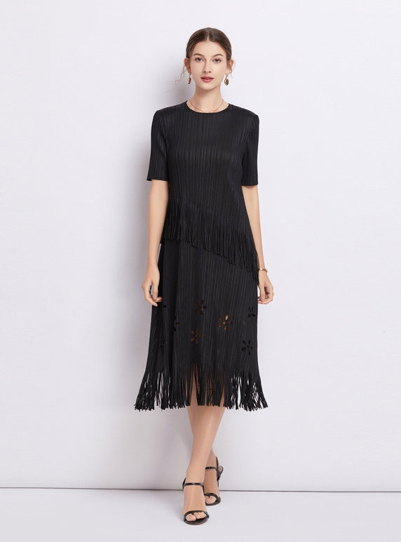 Captivating Fringe: This stunning magenta dress is a testament to the vivaciousness of color and the playfulness of texture. A truly captivating piece, it's designed for the woman who commands attention and celebrates her individuality. The bodice clings gently, giving way to a dropped waist where the magic of movement begins. Each step is a dance as the fringe sways, creating a lively rhythm that complements the wearer's natural grace. The floral embroidery adds a delicate contrast, speaking to a hidden garden in bloom. Ideal for gallery openings or creative social gatherings, this dress pairs beautifully with minimalist accessories to let its boldness take center stage.