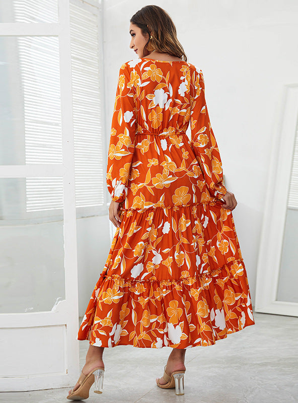 V-neck High Waist Print Irregular Split Dress