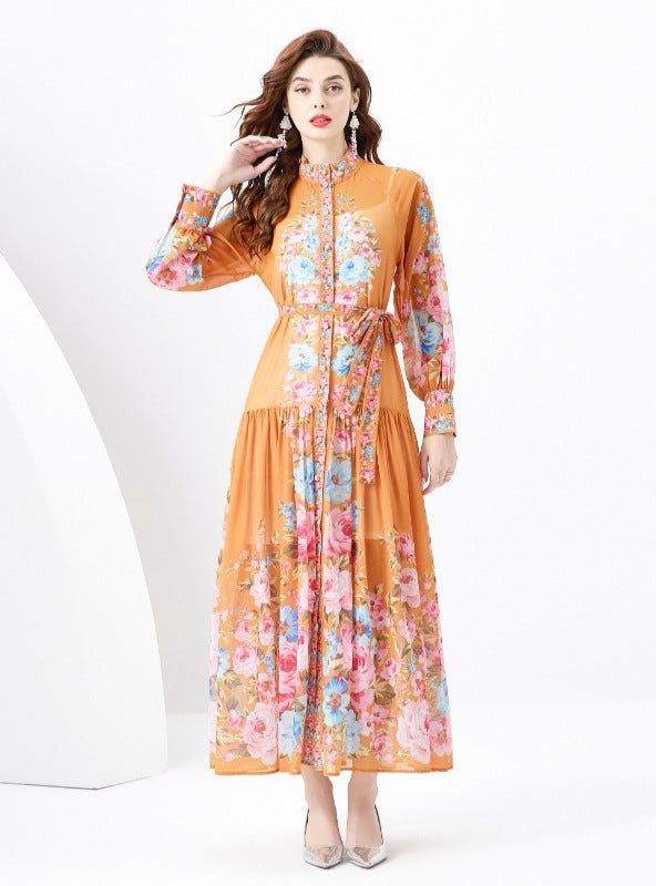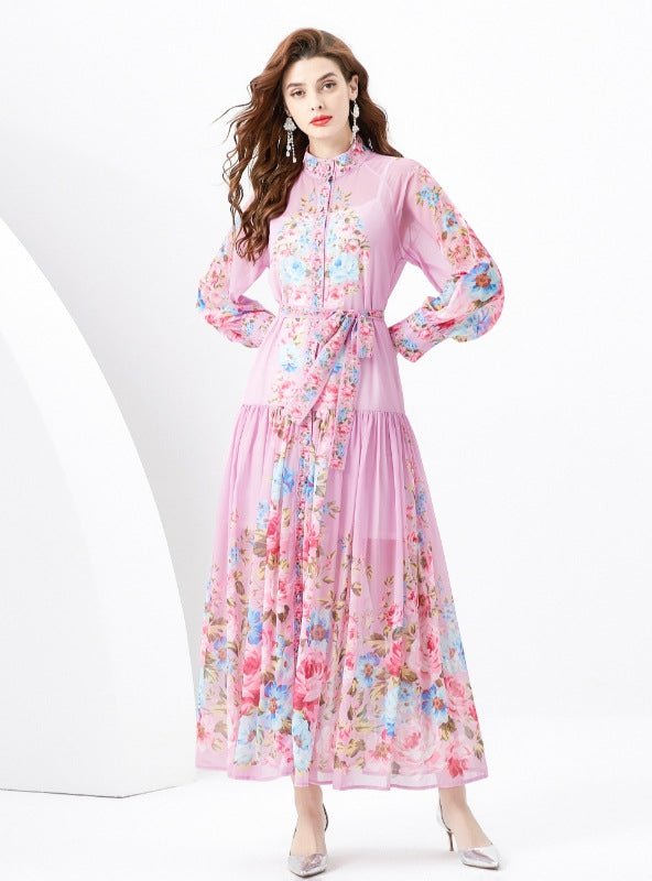 Opulence in Bloom: Imagine stepping into a painter’s garden, where every brushstroke is a bloom—this is the essence of the dress before you. The soft pink canvas sets a delicate stage for the vivid floral prints that adorn it from collar to hem. A mock neck and bishop sleeves create an air of vintage sophistication, while the self-tie belt accentuates the waistline, offering a flattering silhouette. The skirt’s gentle pleating and the sheer overlay whisper stories of timeless elegance and soft femininity. Perfect for a day event or an elegant evening affair, this dress captures the allure of a blossoming garden, promising to be the centerpiece of your wardrobe this season.