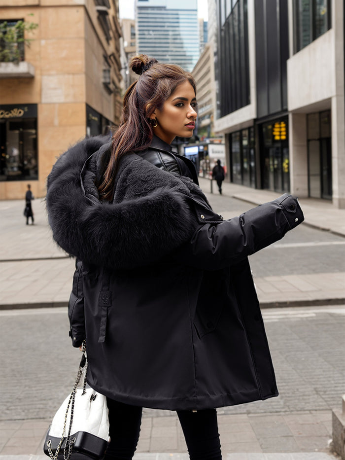 Fashionable and fierce, this coat is designed for those who want to stay warm without compromising on style. The soft faux fur-lined hood not only offers extra protection from the cold but also elevates the overall look of the coat. The cinched waistline provides a tailored, feminine fit, while the sleek front closure keeps the coat modern and functional. Ideal for both casual and formal settings, this coat can be styled with leather pants, jeans, or a chic dress, making it a versatile addition to your winter wardrobe. It's the perfect mix of elegance and utility for winter fashion.