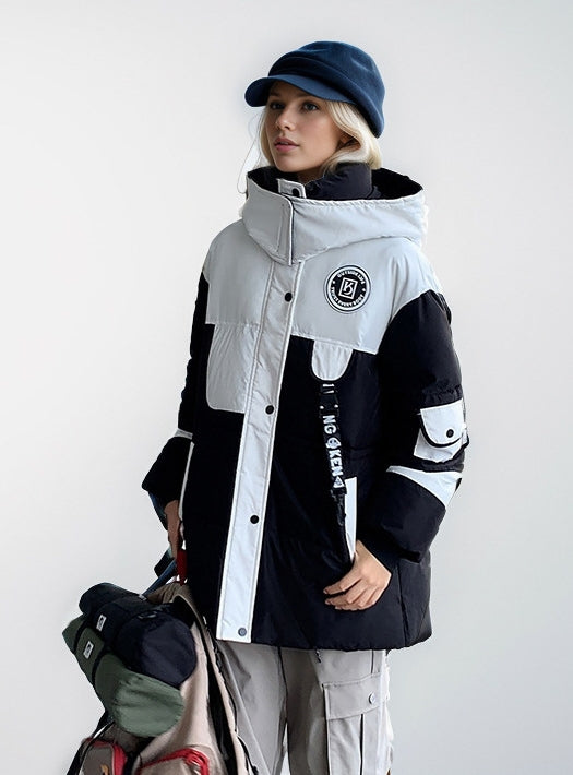 Journey through the winter in style with this black and white outdoor jacket, tailored for both warmth and visual impact. This coat’s bold color-block design brings a modern edge, making it a statement piece for any winter outfit. Built for those who embrace outdoor activities, it’s crafted from durable, weather-resistant materials to keep you cozy even in harsh conditions. The high collar and secure button closures provide additional protection against the elements, while the multiple zippered pockets keep your belongings safe. This jacket doesn’t just excel in function; its sleek, athletic-inspired design makes it perfect for those who want to look fashionable while staying active. With this coat, you’re ready to tackle any adventure that winter brings.