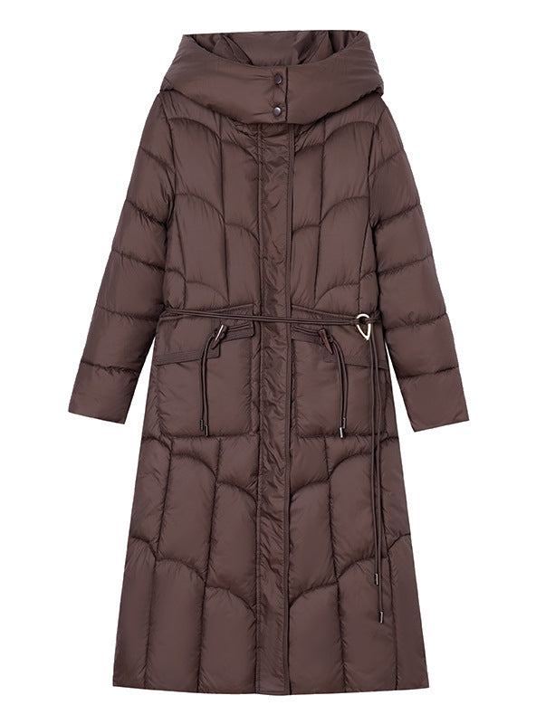 Nicely crafted for a sophisticated winter look, this long brown puffer coat offers a stylish silhouette with its belted waist design. The rich brown shade adds a timeless elegance, perfect for both casual and formal occasions. The coat’s quilted pattern enhances insulation, keeping you warm in cold temperatures, while the cinched waist adds definition to your shape, providing a flattering fit. The high collar and attached hood provide added warmth and protection from the elements, ensuring you stay cozy on windy days. Functional pockets are thoughtfully designed to keep your hands warm or hold small items, adding practicality to this refined piece. The adjustable belt detail with metallic accents adds a subtle charm, making this coat a standout choice for anyone looking to combine fashion with function. This coat is ideal for anyone seeking a warm, stylish, and versatile addition to their winter wardrobe.