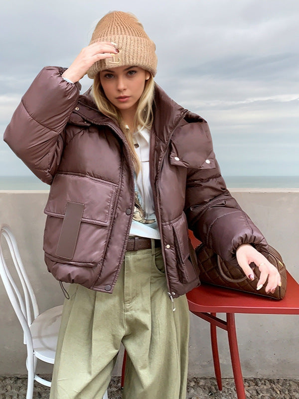 Quaint and timeless, this ivory puffer coat is a staple for those who love a soft, feminine touch in their winter wardrobe. With its delicate quilted pattern and gently oversized silhouette, it provides both style and comfort. The ivory color adds a hint of elegance, making it easy to pair with various outfits, from casual denim to a dressy ensemble. Equipped with large, convenient pockets and a high collar, it’s designed to keep you warm and snug on cold days. The premium fabric ensures not only warmth but also longevity, making this coat an investment in both style and quality. It’s perfect for those who seek a blend of practicality and fashion, offering a light, airy feel that doesn’t compromise on insulation. Ideal for winter strolls or cozy coffee dates, this coat adds a serene, graceful touch to any outfit.