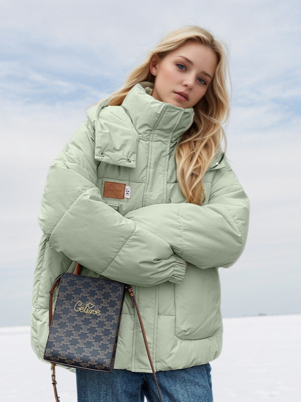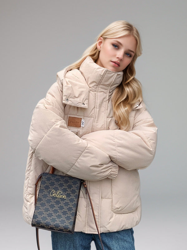 Outstandingly bright and fresh, this ivory-white puffer coat is an eye-catching addition to any winter wardrobe. The relaxed fit and longer length provide ample warmth, while the light color adds a touch of elegance. With a high collar and cozy hood, this coat is designed to keep you snug in cold temperatures. It features multiple functional pockets, adding practicality to its stylish design. The crisp white tone is perfect for creating a classic winter look, easily pairing with a range of colors and styles. For those looking to brighten up their cold-weather attire, this coat offers both style and warmth in one beautifully crafted package.