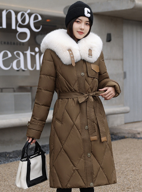 Marking the perfect combination of luxury and practicality, this beige coat with a striking white faux-fur collar exudes elegance. Its plush collar adds a level of sophistication and warmth, while the belted waist creates a flattering shape that’s both chic and comfortable. The quilted design not only adds to its aesthetic appeal but also enhances warmth, making it a practical choice for colder days. This coat is crafted with thoughtful details, including secure front buttons and spacious pockets, ensuring functionality along with its stylish design. It’s an excellent choice for someone looking to make a statement while keeping cozy, as it’s suitable for both everyday wear and special occasions. The faux-fur collar and tailored fit give this coat a luxurious feel that’s bound to turn heads, perfect for the fashion-conscious winter wardrobe.