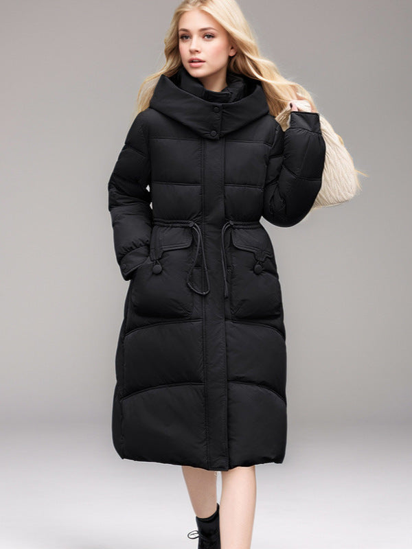 Outstanding in its simplicity and elegance, this beige drawstring coat combines a minimalist design with practical details. The cinched waist feature allows you to adjust the fit, creating a flattering silhouette that keeps the warmth in. The high collar and padded design provide excellent insulation, ideal for those extra chilly days. With spacious front pockets and a comfortable hood, this coat balances style with functionality. The neutral color makes it easy to pair with a range of outfits, making it a versatile option for both casual and more polished occasions. For those seeking a coat that combines elegance with warmth, this piece is a timeless addition to your wardrobe that delivers on both fronts.