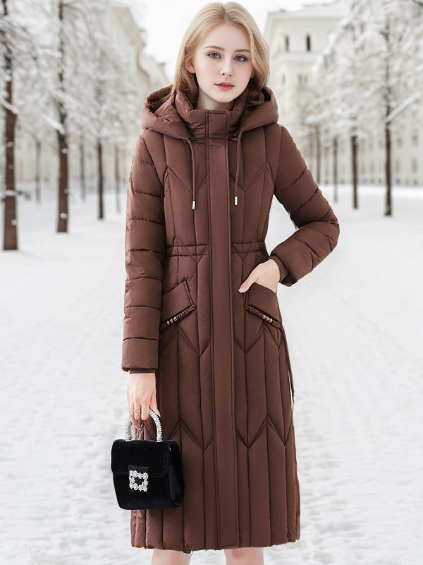 Opting for a sophisticated look, this long brown coat with intricate quilting stands out as a refined choice for winter. The geometric quilted pattern not only enhances the coat’s aesthetic appeal but also provides additional warmth. The tailored fit and adjustable hood offer a blend of practicality and elegance, perfect for colder days. This coat features zippered pockets, allowing you to securely carry essentials while keeping your hands warm. Its structured design and rich brown tone make it suitable for both day-to-day wear and more formal occasions. This coat is ideal for those who appreciate subtle, stylish details and a touch of sophistication in their winter outerwear, ensuring both warmth and elegance.