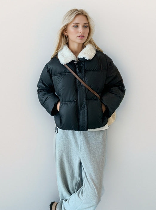 Midway through winter, you’ll find yourself reaching for a coat that is as versatile as it is stylish, and this piece delivers on both fronts. This first coat, with its rich, warm brown tone, features a luxurious sherpa-lined collar that provides exceptional warmth around the neck and adds a textured contrast to the otherwise smooth, quilted exterior. The cropped cut makes it perfect for casual and semi-casual settings, giving it a youthful edge while maintaining functionality. The coat’s design blends a rugged outdoorsy vibe with modern fashion sensibilities, making it an ideal choice for city strolls or countryside escapes alike. With its spacious cut, you can layer comfortably underneath, and the durable zipper and snaps ensure that you stay insulated against cold winds. Pair this coat with jeans or trousers for an effortlessly chic, relaxed look that speaks to both comfort and style.