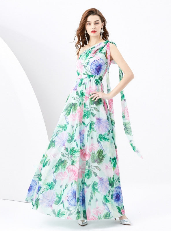 Organic Whimsy: Immerse yourself in the blooming essence of spring with the Organic Whimsy dress. This one-shoulder masterpiece is a canvas of soft pastel florals that float against a lightweight, ethereal fabric. It's an artistic celebration of nature's own palette, featuring delicate greens, pinks, and blues that beckon the warmth of sun-kissed gardens. The cinched waist, accented with a subtle green belt, unfolds into a full-length, flowing skirt that captures the gentle dance of petals in the breeze. Perfect for a garden party, wedding, or any event where elegance is in full bloom, this dress will ensure you embody the vibrancy and renewal of the season.