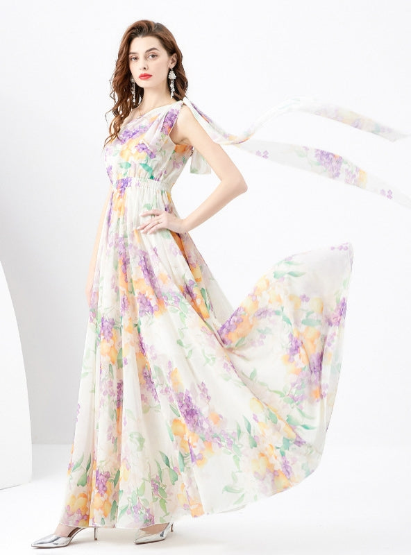 Overgrown Eden: Evoke the ethereal beauty of a secret garden with the Overgrown Eden dress, a garment that brings to life the wild and whimsical essence of nature's untamed splendor. This one-shoulder gown is a delicate dance of soft pastels and vibrant hues, mirroring the serene yet lively palette of an overgrown floral haven. The dress blooms with generous brushstrokes of lavender and gold, with airy fabric that floats around you like a soft mist at dawn. Its cinched waist unfolds into a flowing, floor-length skirt that sways with every step, capturing the romantic allure of a blossoming field kissed by the wind. Perfect for outdoor weddings or al fresco soirees, this dress will envelop you in its poetic romance.