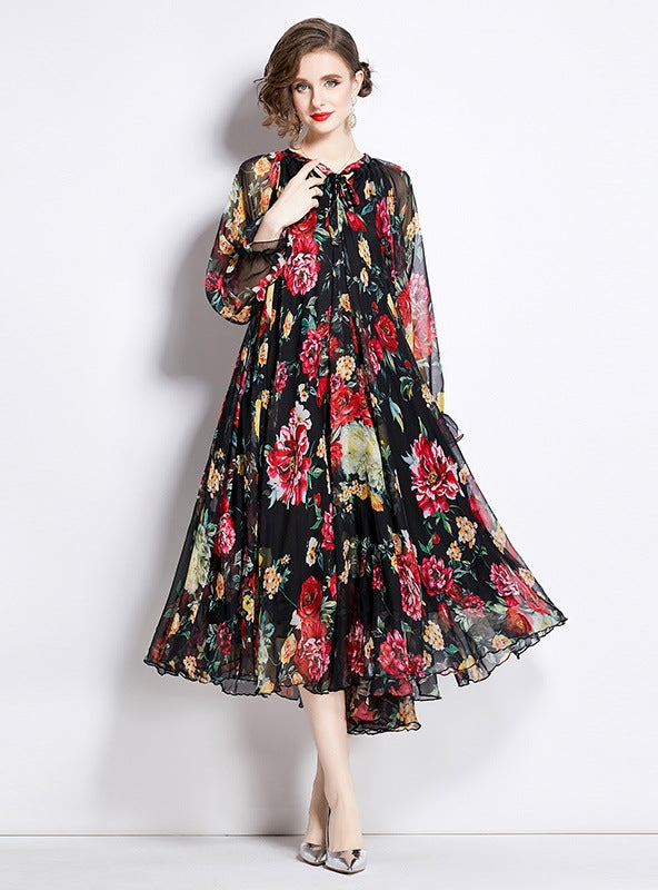 Outstanding in its romantic allure, this floral chiffon midi dress is a true symphony of elegance and style. The sheer overlay is a lush garden of rich, blooming roses, daffodils, and wildflowers cascading on a dark canvas that makes every color flourish. Its full sleeves puff gently before cinching at the wrist, creating a delicate balloon effect that adds a touch of vintage charm. A tie at the neck brings an additional element of sophistication, while the cinched waist and flowing skirt celebrate the female form. The subtle allure of the dress is enhanced by the light-catching fabric, perfect for evening soirées or autumn weddings. Pair it with minimal jewelry and sleek heels to let the dress's vibrant pattern and sophisticated silhouette capture the spotlight.