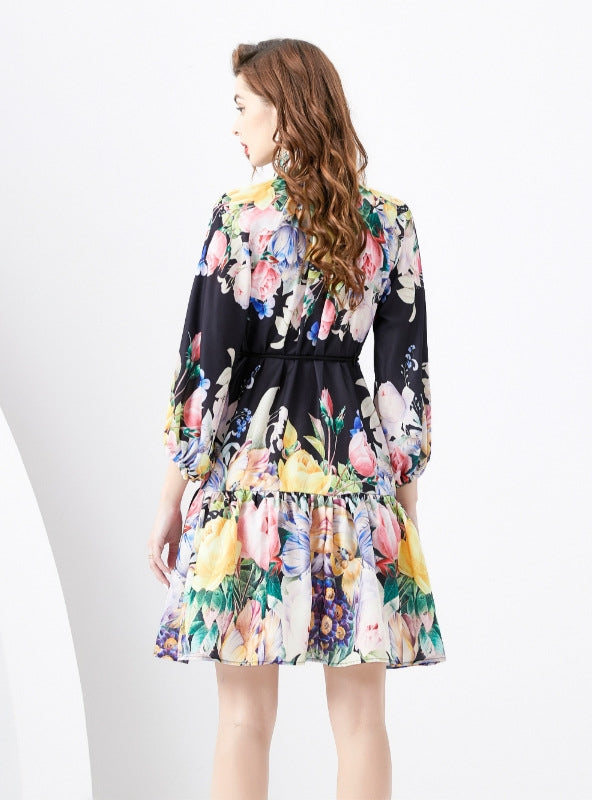 Overflowing with floral exuberance, this high-necked dress captures the essence of spring. Its elegant structure, marked by a button-up front and a waist-defining belt, makes it a classic piece with a touch of modern flair. The long sleeves end in gentle cuffs, and the skirt flares out just above the knee, providing a playful, yet polished look. The rich canvas of dark hues sets the stage for the colorful floral arrangement that adorns the fabric, making it a standout garment for any event. Whether paired with heels for a formal occasion or flats for a casual outing, this dress promises to be as versatile as it is stunning.